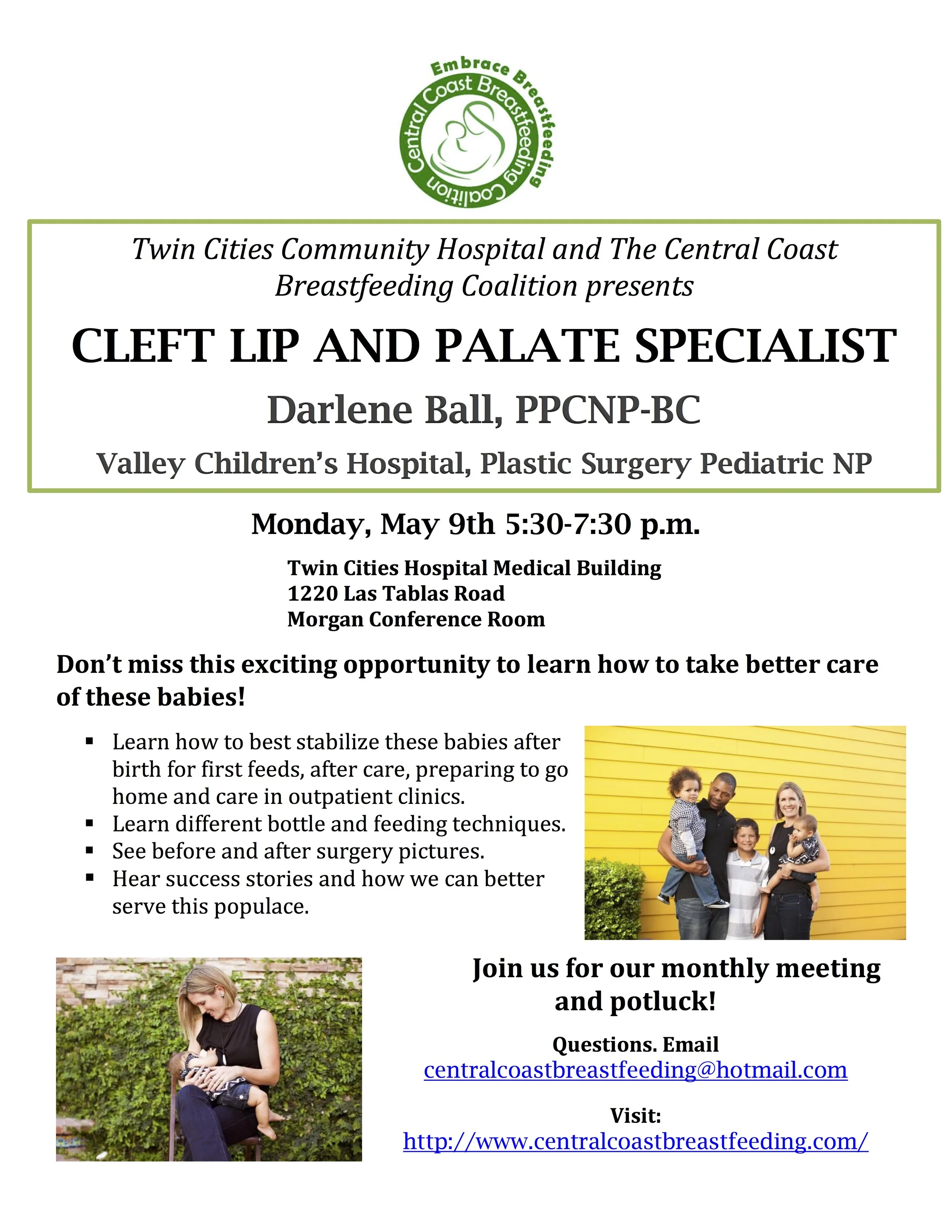 JOIN US FOR OUR MAY EDUCATION MEETING ON MONDAY, MAY 9TH FROM 5:30-7:30PM IN THE MORGAN CONFERENCE ROOM AT TWIN CITIES COMMUNITY HOSPITAL IN TEMPLETON. PRESENTING WILL BE DARLENE BALL, PPCNP-BC, VALLEY CHILDREN'S HOSPITAL, PLASTIC SURGERY PEDIATRIC NP.